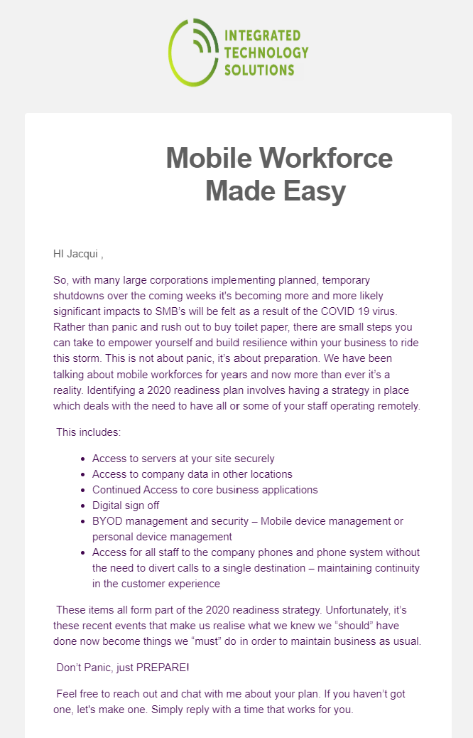 For some organizations, the COVID-19 crisis will benefit their businesses, especially IS service providers who provide remote work solutions. ITS offer such services and have communicated they are open for business to support organizations who need their staff to work from home.
