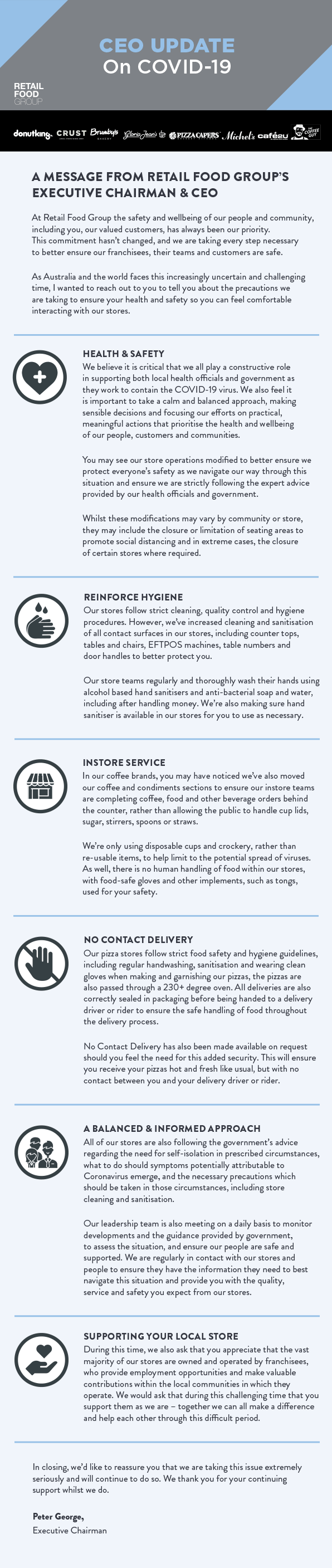 The executive chairman and CEO’s message felt more ominous; however, it was more personal because the communication was from a leadership position, not a marketing department. Retail Food Group is an ASX-listed franchise group, owning multiple food retail franchise concepts in Australia.