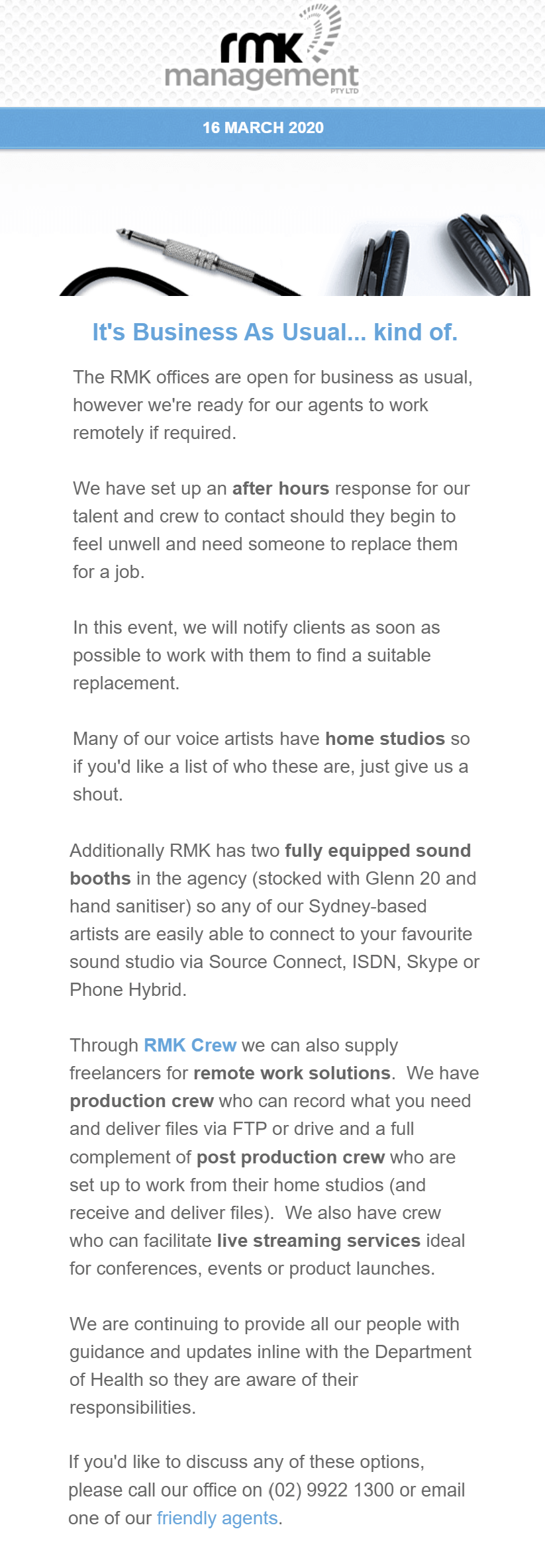 RMK Management is a media talent and crew management agency. When ad agencies or other organizations require video production, they hire the crew and talent from RMK. RMK’s email communicates the changes they have made to their processes, although it sounds like this organization already had a number of freelance and work-from-home procedures in place.